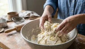 Then comes the part most recipes skip no measuring precision. You don’t need exact cups or grams. You watch the dough, feel it, and adjust naturally. It might sound intimidating at first, but once you try it, it actually feels freeing.